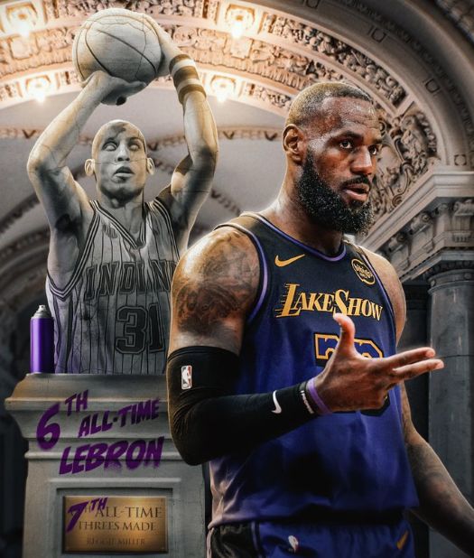 而在第二节末段,他又命中一个三分,超越米勒独居历史第六。